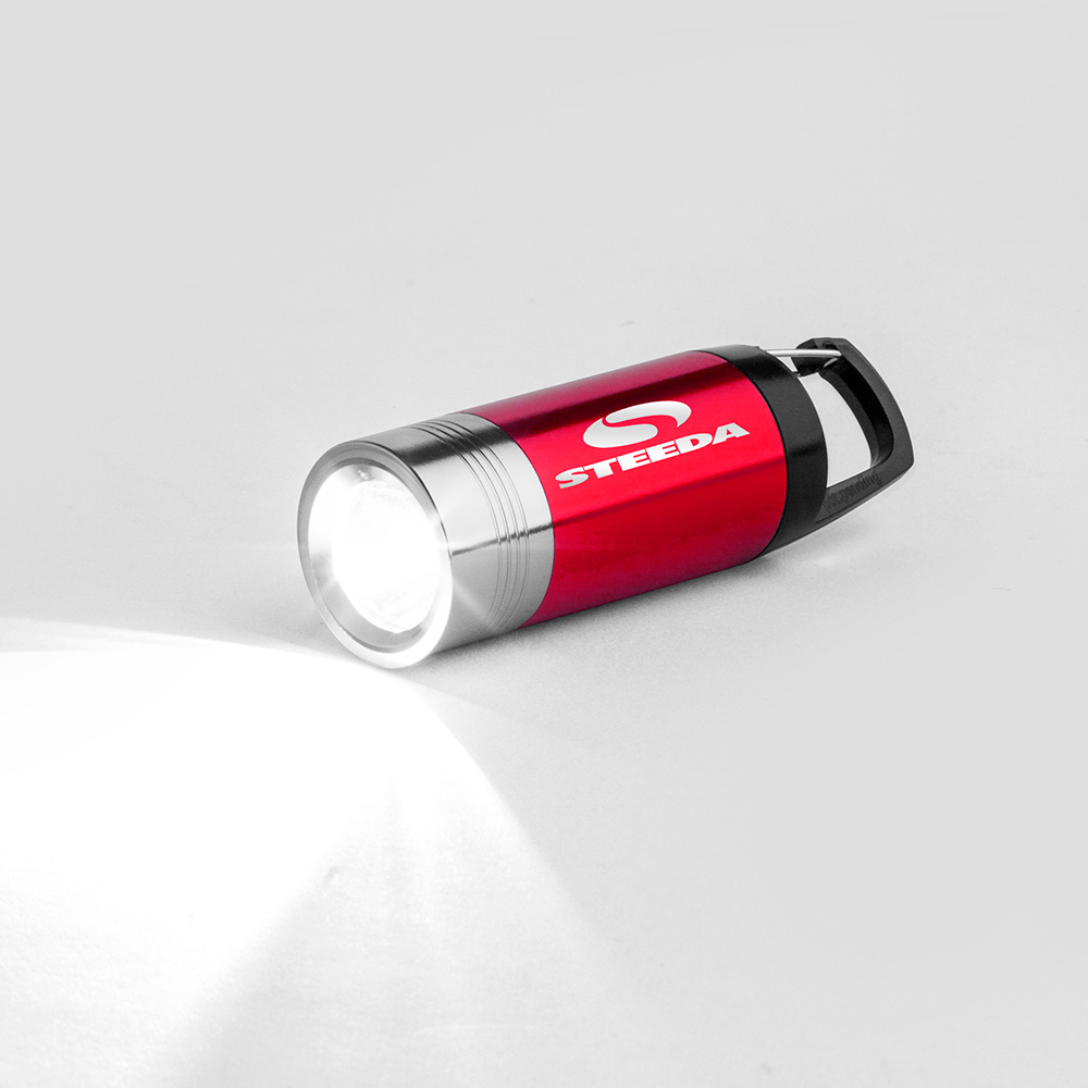 - Portable LED flashlight with lightweight rich enamel-colored finish and metallic silver tip accent. Use as a focused-beam flashlight or lantern. Carabiner hanging function and push-button on/off switch. 30 lumens. Requires 2 CR2032 batteries (included).