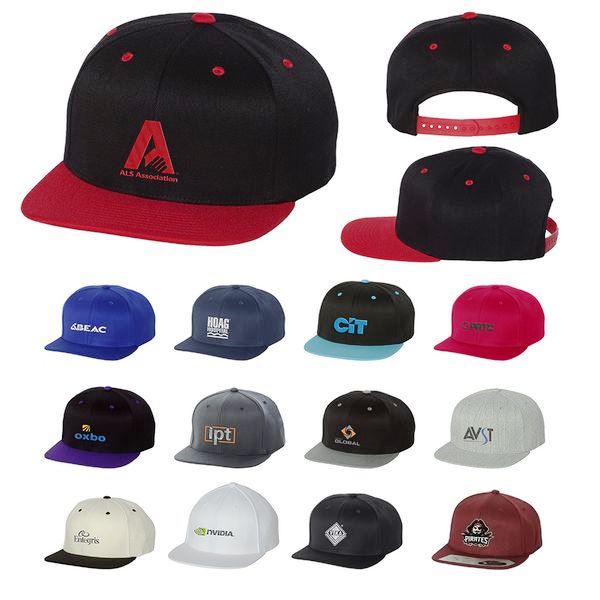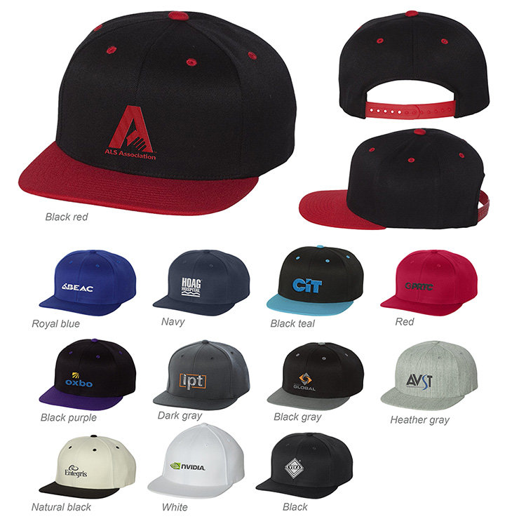 - 83/15/2 acrylic/wool/spandex structured, high-profile, six-panel cap.Flat visor, 3-3/4 crown, adjustable Flexfit technology. Classic shape. Matching plastic snap undervisor. Hard buckram. Moisture-absorbent elastic sweatband. Premium wool blend. Mill# 110F