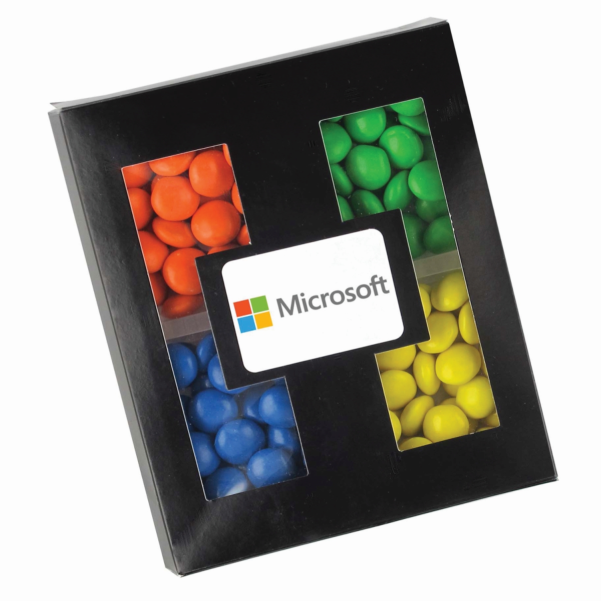 - Your customers will grow sweet on your brand when you pass along this 4-way chocolate button box at your next event. Measuring 4 1/4"W x 5 3/8"H x 3/4"D, these die-cut custom boxes can be imprinted with your logo using a one color direct imprint on the box or a full color label for added appeal. Perfect for building your clientele at tradeshows, company events and much more, this customizable box will make a great impression at every event.