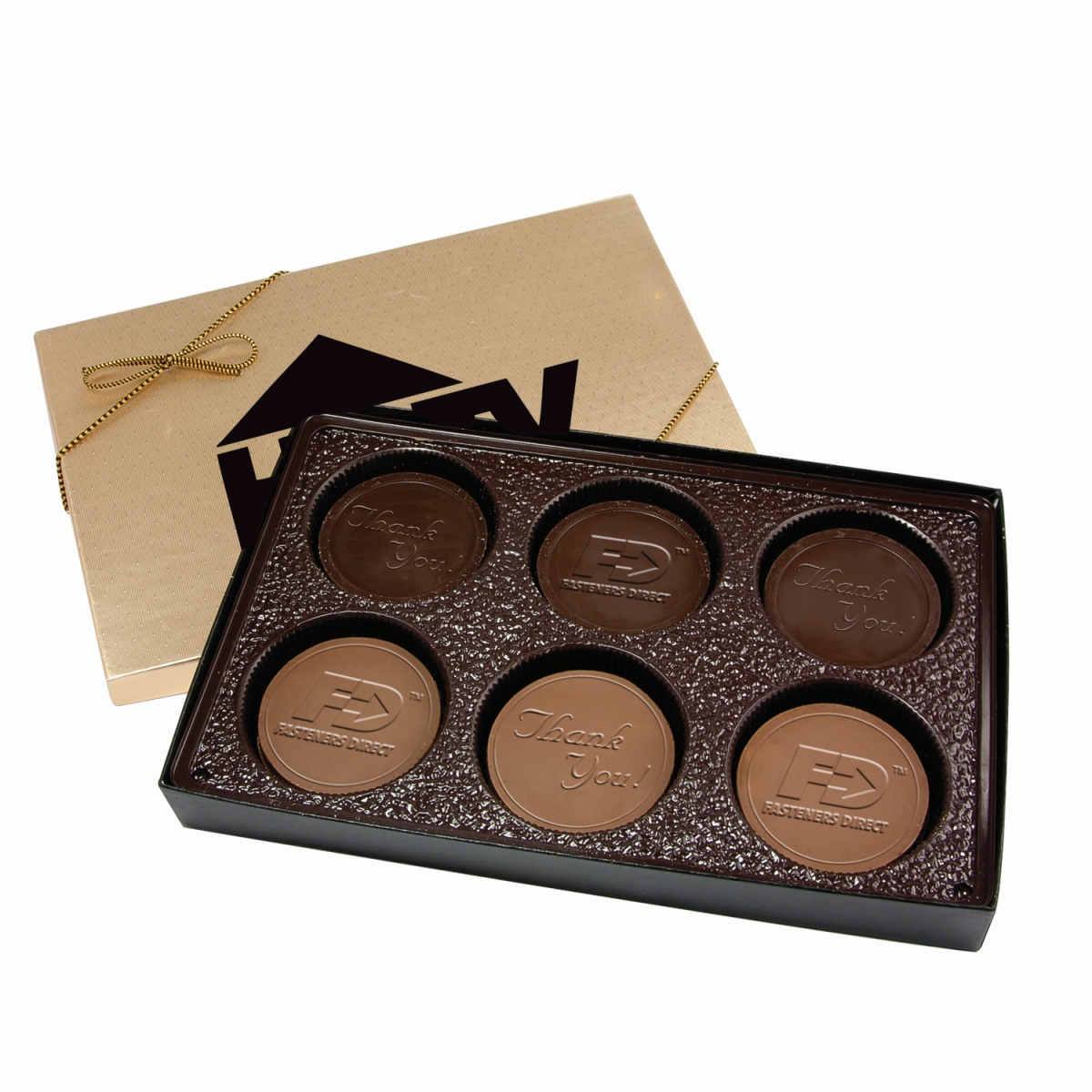- A gift with a little something for everyone! Great for company giveaways, incentive programs or holiday gifts, this gift box features 6 scrumptious milk and dark chocolate covered cookies. The cookies are custom molded with your company logo or message. The impressive, display is presented in a gold, silver or white gift box with a coordinating ribbon. A sure item to satisfy any sweet tooth!