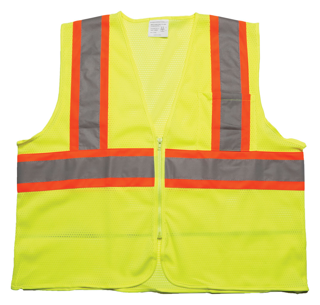 - ? Our tri-color vest provides extra visibility day or night.? Meets or exceeds ANSI/ISEA Class 2 safety standards.? Includes a zipper front closure, large chest pocket, 2" reflective tape and 100% polyester mesh fabric.