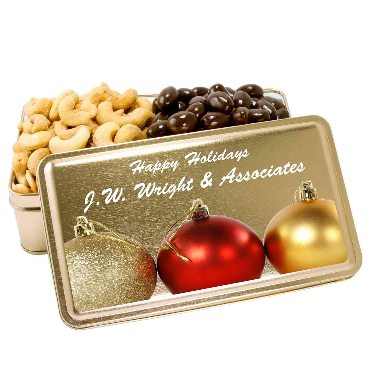 - Your customers will be snacking with your brand in mind when you pass along this 2-share tin with salted cashews and dark chocolate almonds. Ideal for sharing, this 4 7 /16"H x 7 13/16"W x 2 1/8"D tin will make a great impression on every recipient at upcoming seminars, tradeshows and a variety of other snack-worthy occasions. Customize this gift with your company name and logo and benefit from daily brand exposure during every snack.