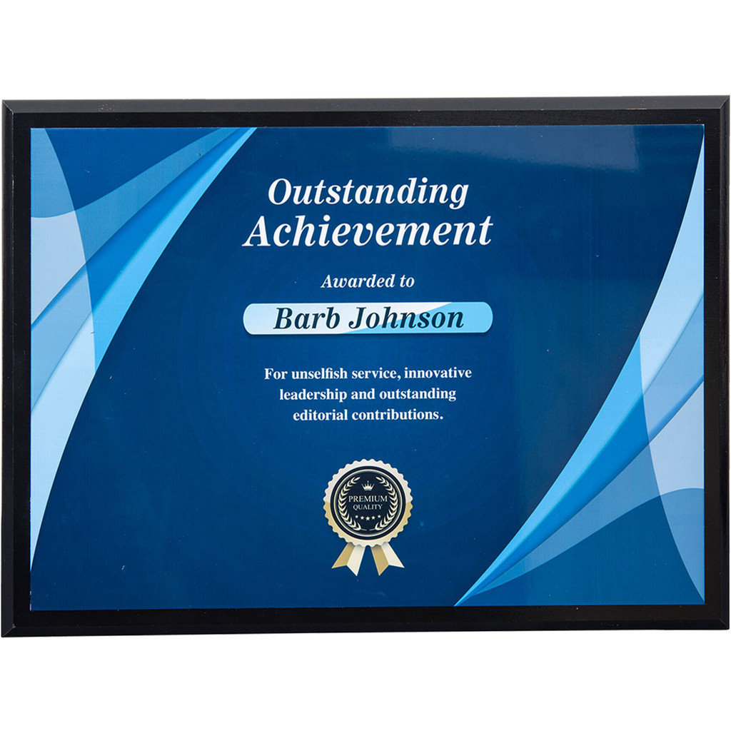 - These rich sublimated plaques are perfect for awards and recognizing goals. The sublimated plaque prints in full color on a white, gold or silver metal plate. Imprints are semi-transparent, base metal may show through the colors. White ink cannot be printed. The metal plate then adheres to a handsome black wooden base which can be hung on the wall or stood on a desk. Art shown is for presentation purposes only. Client must provide artwork. USA Assembled