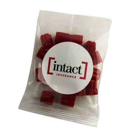 - This 1 oz. cherry bites goody bag is the perfect promotional handout for parades, tradeshows or any event that would benefit from this inexpensive, colorful and delicious treat! Featuring a 4.929" x 2.5" direct imprint area with a 3" x 4" labeled area, this customizable treat bag can be imprinted using a 1-4 spot color direct imprint or a 1-4 color process label! Customize this non-melt product for your next event.