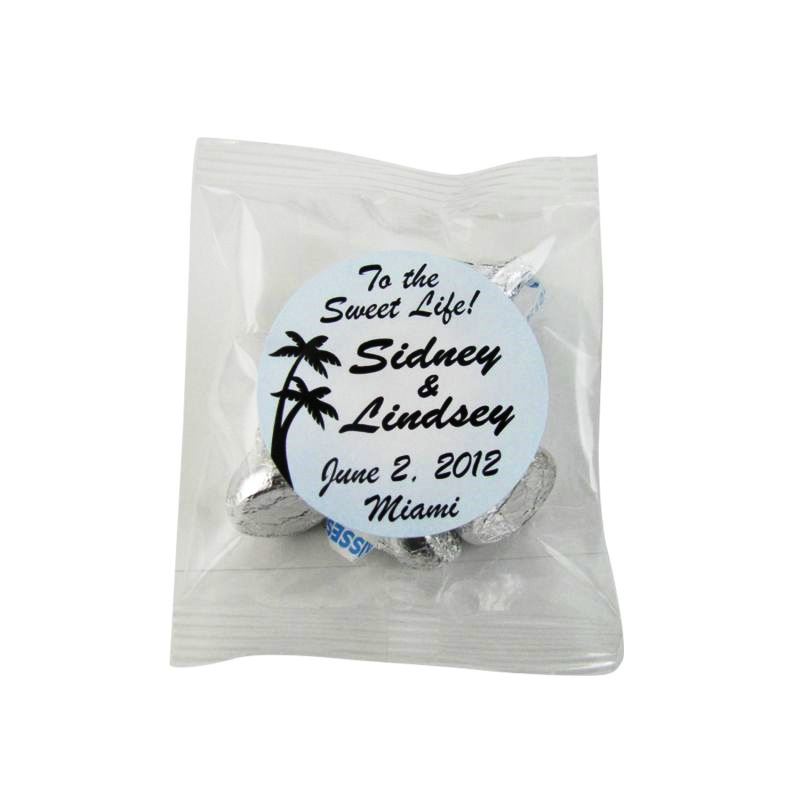 - 1oz. Hershey's Chocolate Kisses (R) Goody Bag. Perfect for parades, trade shows or any event where you want to give an inexpensive, colorful and delicious treat. Direct imprint bag dimensions: 4.929" x 2.5". Labeled bag dimensions: 3" x 4". Non melt product.