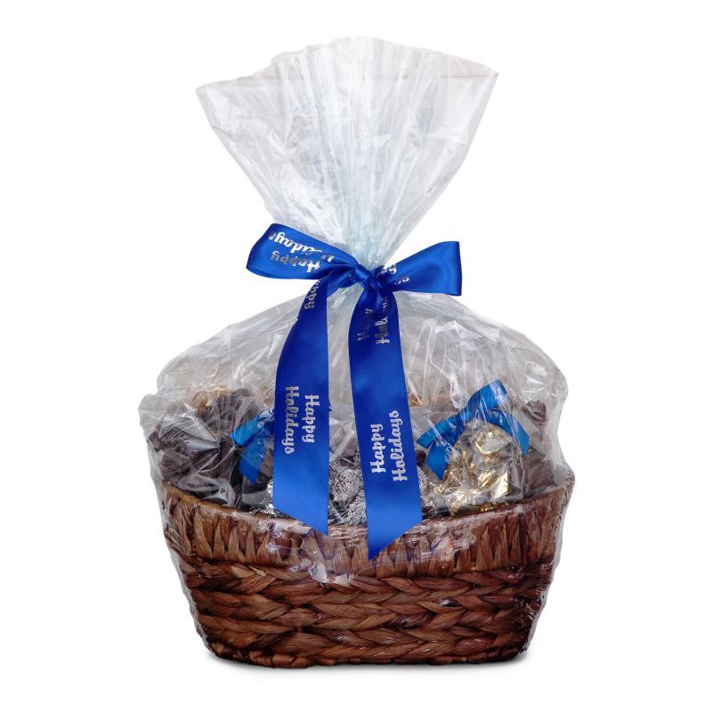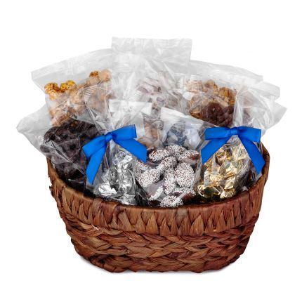- Packaged in a wicker basket you'll find 2.5 lbs. of individually bagged goodies! It's filled with rainbow nonpareils milk or dark chocolate covered mini pretzels, yogurt covered mini pretzels, caramel popcorn, salted cashews, gourmet jelly beans, milk/gold twist wrap truffles and dark/silver twist wrap truffles. Great for promotional or corporate gifts, it's wrapped in a clear bag and tied with an imprinted ribbon.