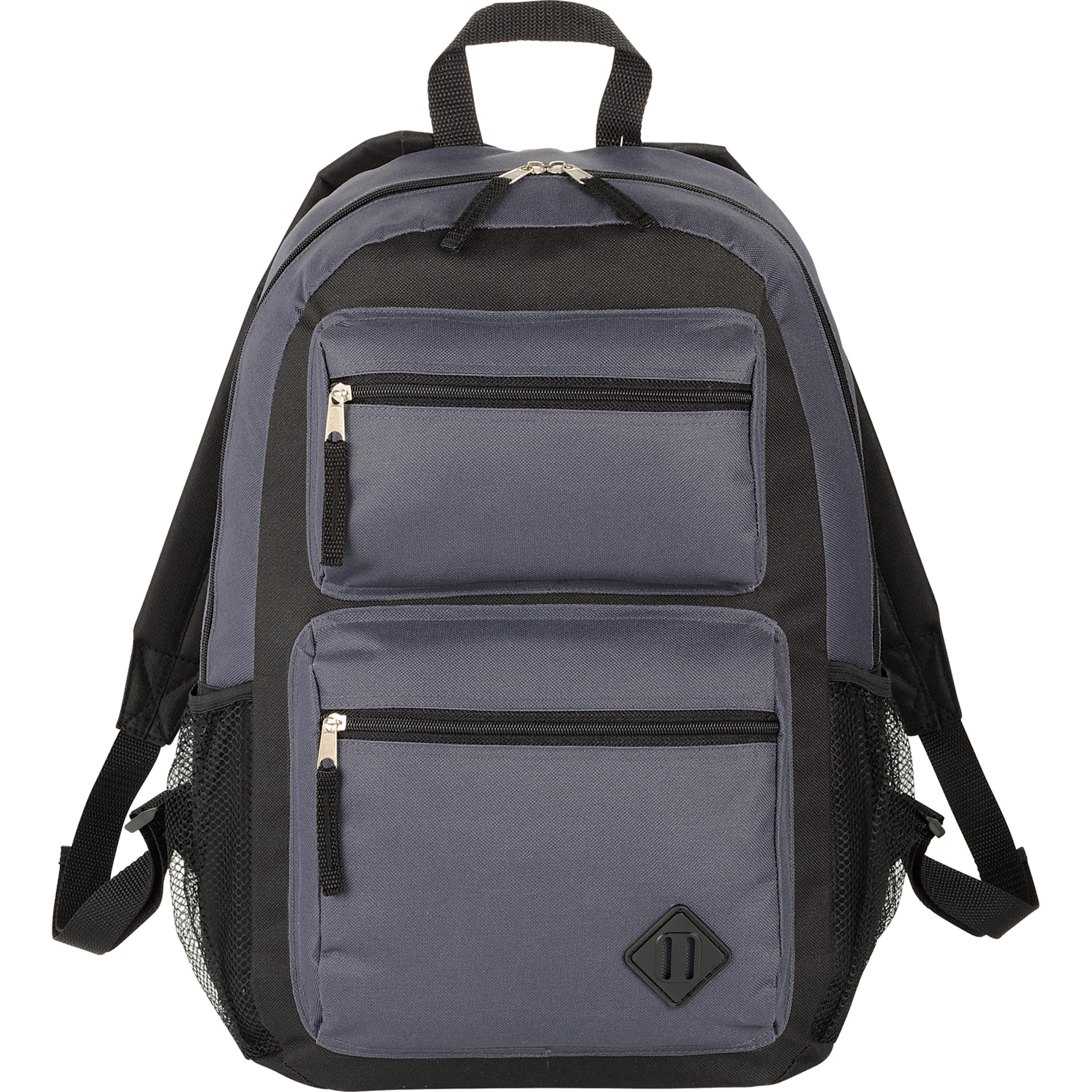 - The Double Pocket Backpack is made from durable 600D PolyCanvas and has a roomy zippered main compartment. Additional features of this stylish bag include two front zippered pockets, a lash-tab accent, comfortable shoulder straps, and a sturdy grab-handle that make it easy to bring on the go, no matter where your day takes you.