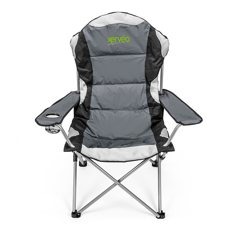 - Comfy 600D padded chair folds-up and fits into matching color 210D polyester carry case with convenient black shoulder strap. Chair features: armrests with can holder; sturdy steel tube frame that supports up to 300 lbs.