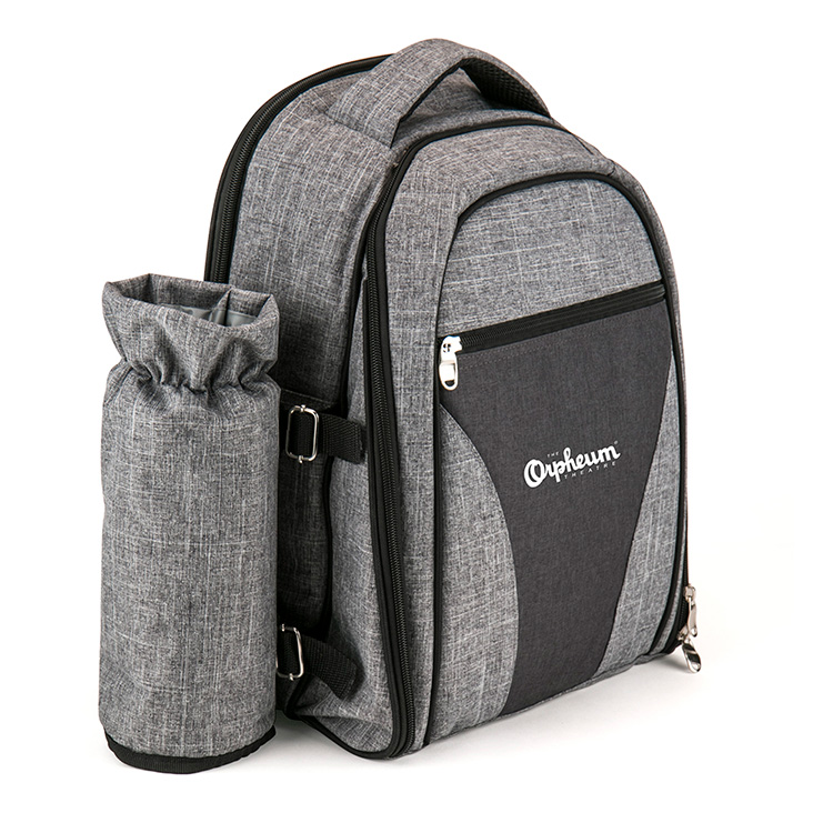 - Four-person picnic backpack makes meals on the go a breeze! Includes: (4) plastic plates, (4) cloth napkins, (4) plastic wine glasses, (4) metal/plastic sets of utensils, salt and pepper shakers, cutting board, bottle opener, cheese knife and fleece blanket. Packaged in black menswear-patterned backpack with insulated wine pocket and insulated cooler compartment.