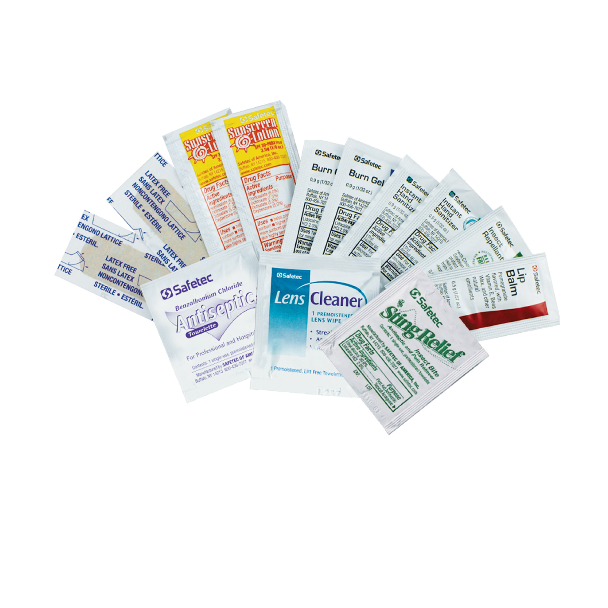 - Kit Includes A Bag With The Following Packets: 2 Sunscreen Lotion, 1 Lip Balm, 2 Instant Hand Sanitizer, 2 Insect Repellent, 2 Sting Relief Wipe, 2 Lens Cleaner Wipe, 1 Skin Lotion, 2 Burn Gel, 2 Antiseptic Wipe And 4 Bandages.