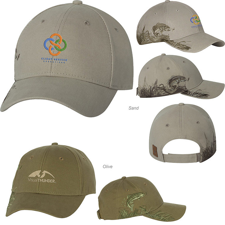 - 100% brushed cotton twill. Structured front; mid-profile; six-panels. Pre-curved visor hook and loop backstrap. Detailed embroidered wildlife scene on right side Dri Duck embossed leather patch left of back vent MILL# 3256