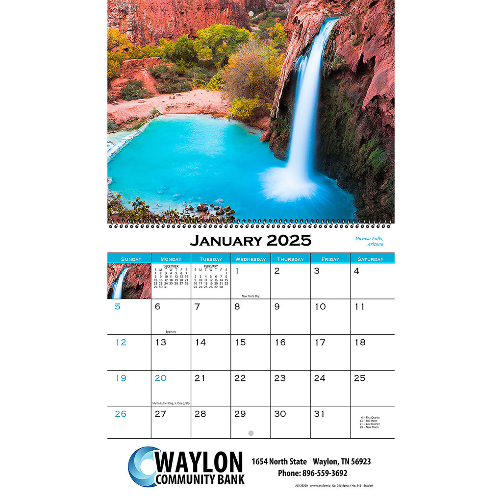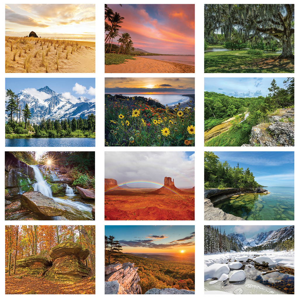 - Scenic landscapes from around the United States are featured in this calendar. The location of each image is also noted, so you can go see it for yourself. 13-month, 4-color scenic wall calendar. Great for insurance agents, brokers, financial consultants, healthcare, manufacturing, construction, real estate, and more. U.S. Federal holidays and Canadian National holidays are marked. USA Made