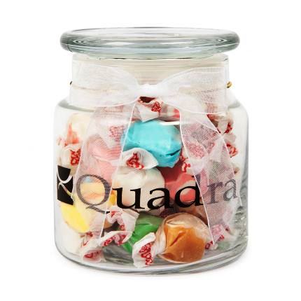 - Replenish your contact list with customized candy jars! These glass jars are filled with 22 oz. of rainbow bubble gumballs that will bring plenty of visitors to your desk. Available with a one color imprint, add a name, logo or message to the jar. It's also wrapped with a pretty white bow for a high-end look. This will make a great promotional giveaway at tradeshows, company events, and even as a wedding or party favor.