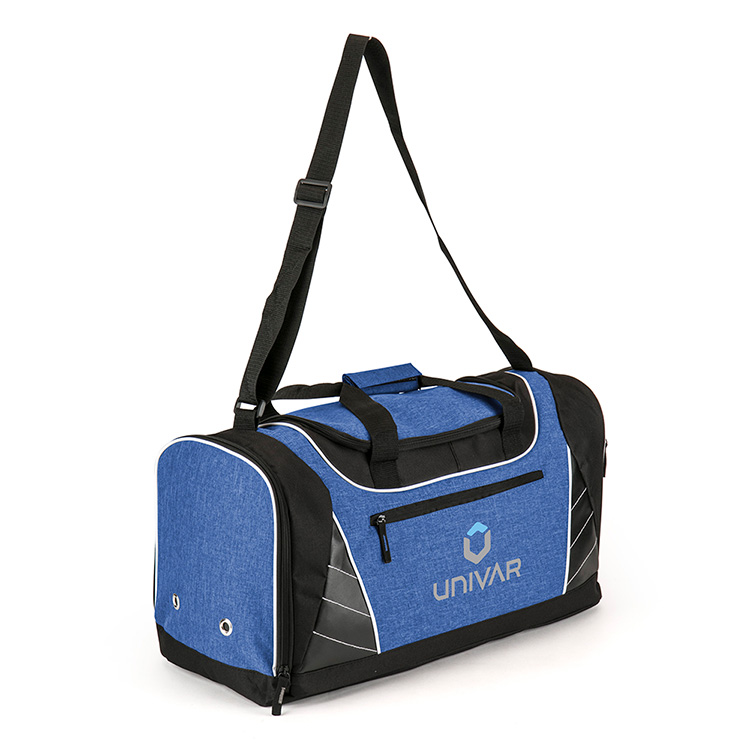- Heathered300D/600D polyester two-tone duffel bag with deco stitching with wide mouth opening main compartment for easy packing. Shoe pocket with ventilation grommets; front zipper pocket; wrapped handles with hook and loop closure; adjustable shoulder strap.