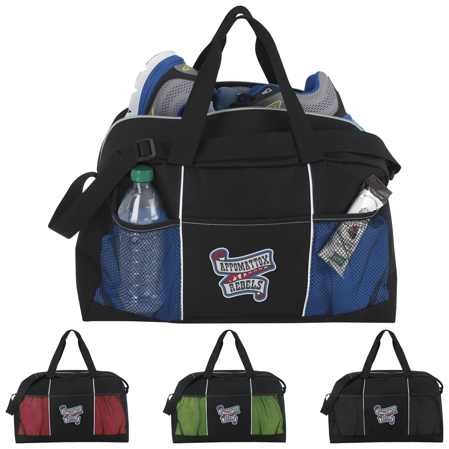 - This duffel has what you need to hit the gym in style. The main zippered compartment has plenty of room for your clothes and the front slip pocket and mesh pockets provide room for additional items.